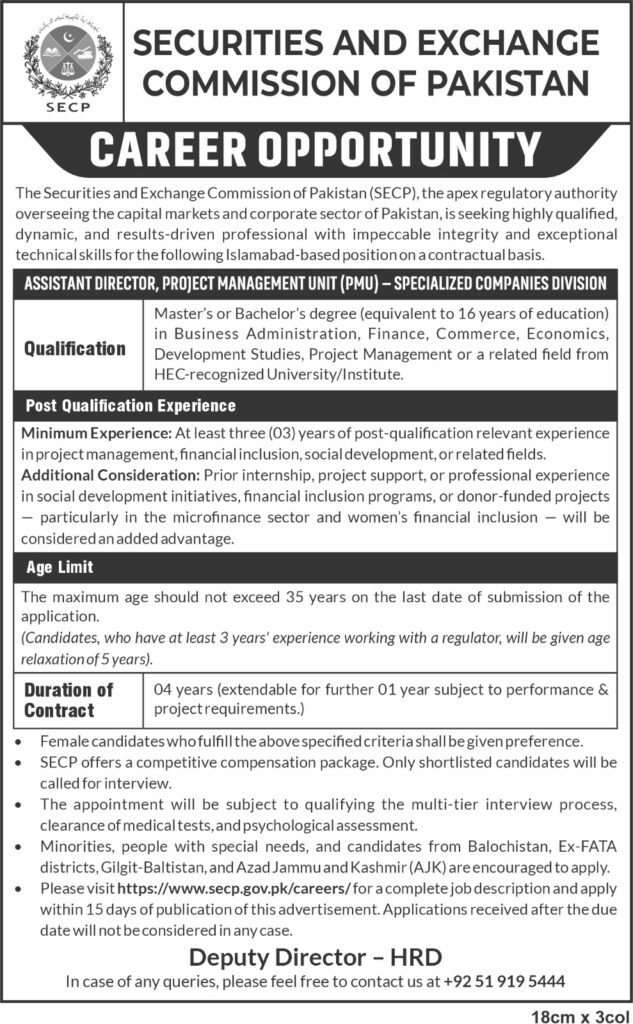 Most SECP jobs are offered in Islamabad, where the organization’s headquarters is located, although some roles may exist in other major cities.